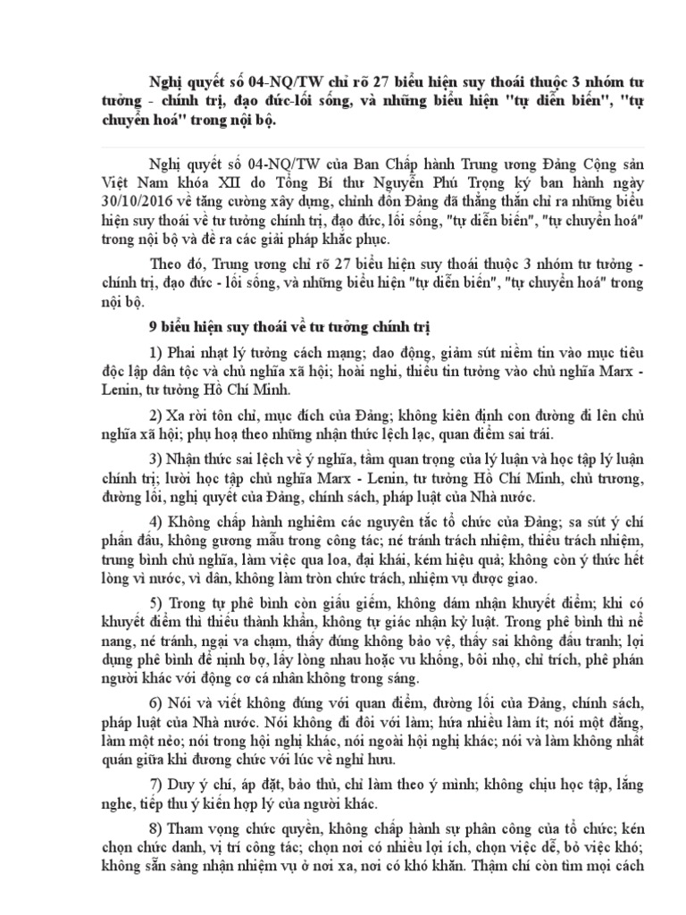 Nghị quyết số 04-NQTW chỉ rõ 27 biểu hiện suy thoái thuộc 3 nhóm tư tưởng - chính trị đạo đức - lối sống và những biểu hiện tự diễn biến tự chuyển hoá trong nội bộ. Theo đó Trung ương chỉ rõ 27 biểu hiện suy thoái thuộc 3 nhóm tư tưởng chính trị đạo đức lối sống và những biểu hiện tự diễn biến tự chuyển hoá trong nội bộ. Hoài nghi thiếu tin tưởng vào chủ nghĩa Mác-Lênin tư.